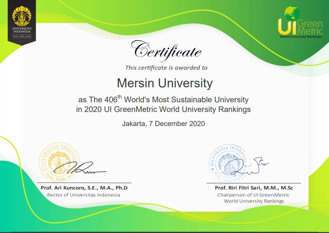 Mersin Üniversitesi 2020 yılında ilk başvurusu ile Greenmetric Dünya Üniversiteleri Yeşil ve Sürdürülebilir Kampüs Sıralamasında dünya 406.'sı ve Türkiye 26.sı olarak yerini almıştır.